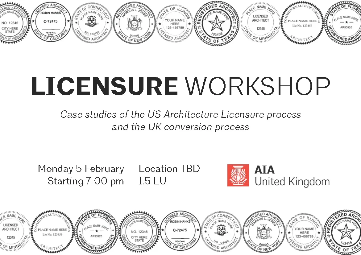 The AIA UK welcomes peer speakers to present case studies on various paths to licensure and will discuss the process for those pursuing a US architecture license as well as for those interested in the process for conversion from UK/EU to a US and a US to a UK license. The first case studies will cover the three NCARB phases - education, experiences and exams - with a special speaker on the new 5.0 ARE format. This will be followed by a discussion of US to UK conversion and the new NCARB process for those already possessing a non-US license.