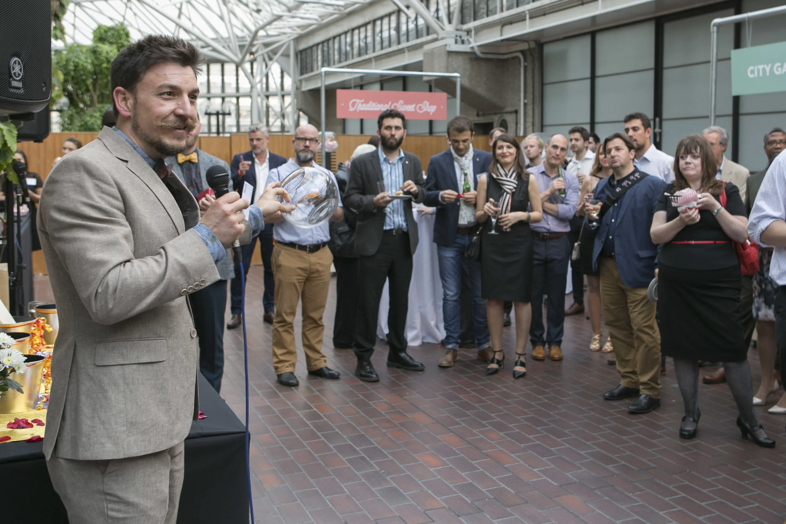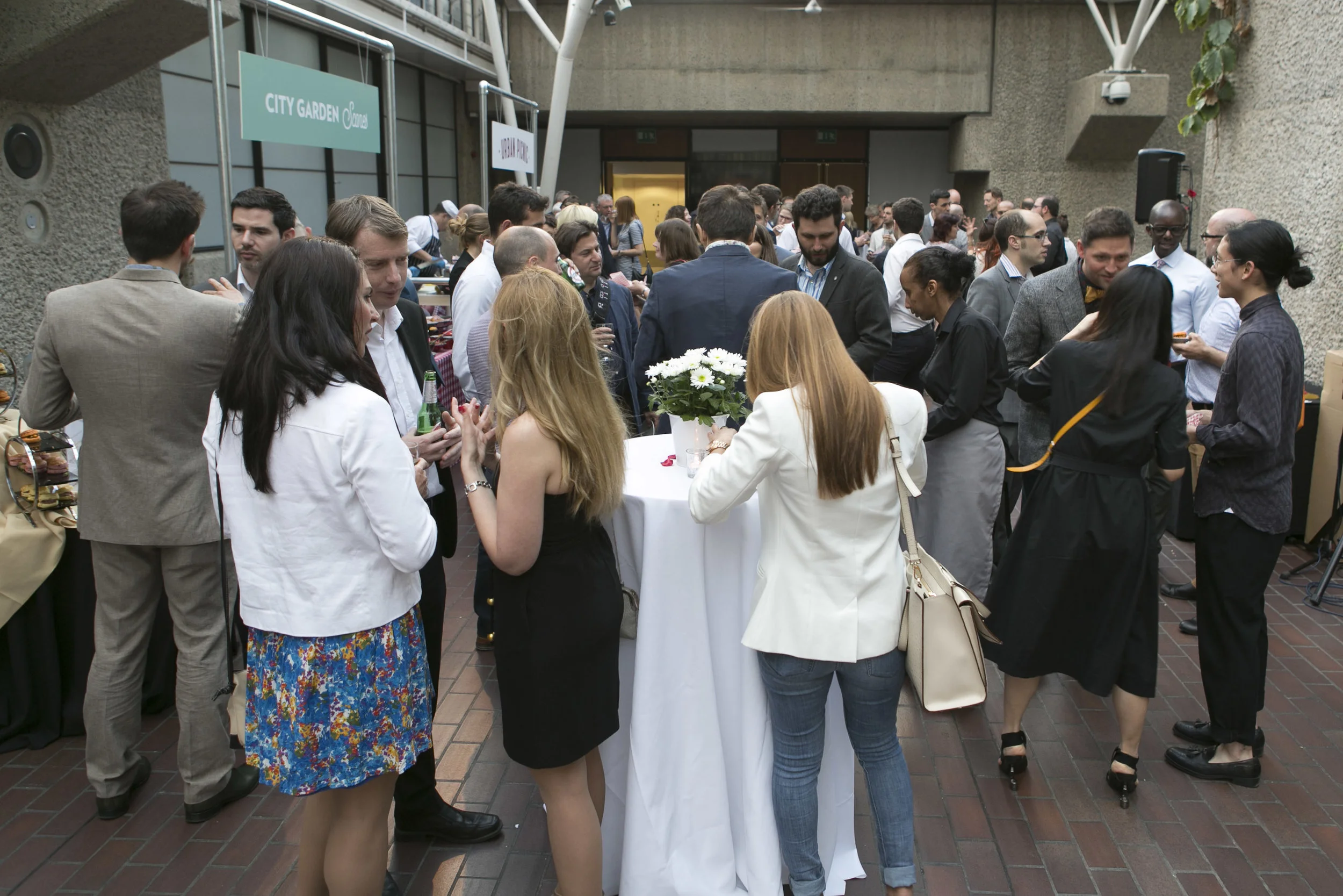 Dinner was served a’la carte via “street food” stalls set up around the terrace and allowed guests to wander the gardens whilst enjoying their food and drinks. It was a rare beautiful day following a string of rainy days; the enclosed terrace must have insured against the rain. Guests enjoyed a beautiful sunset through the glazed interior, and were able to socialise with a wide variety of industry professionals.