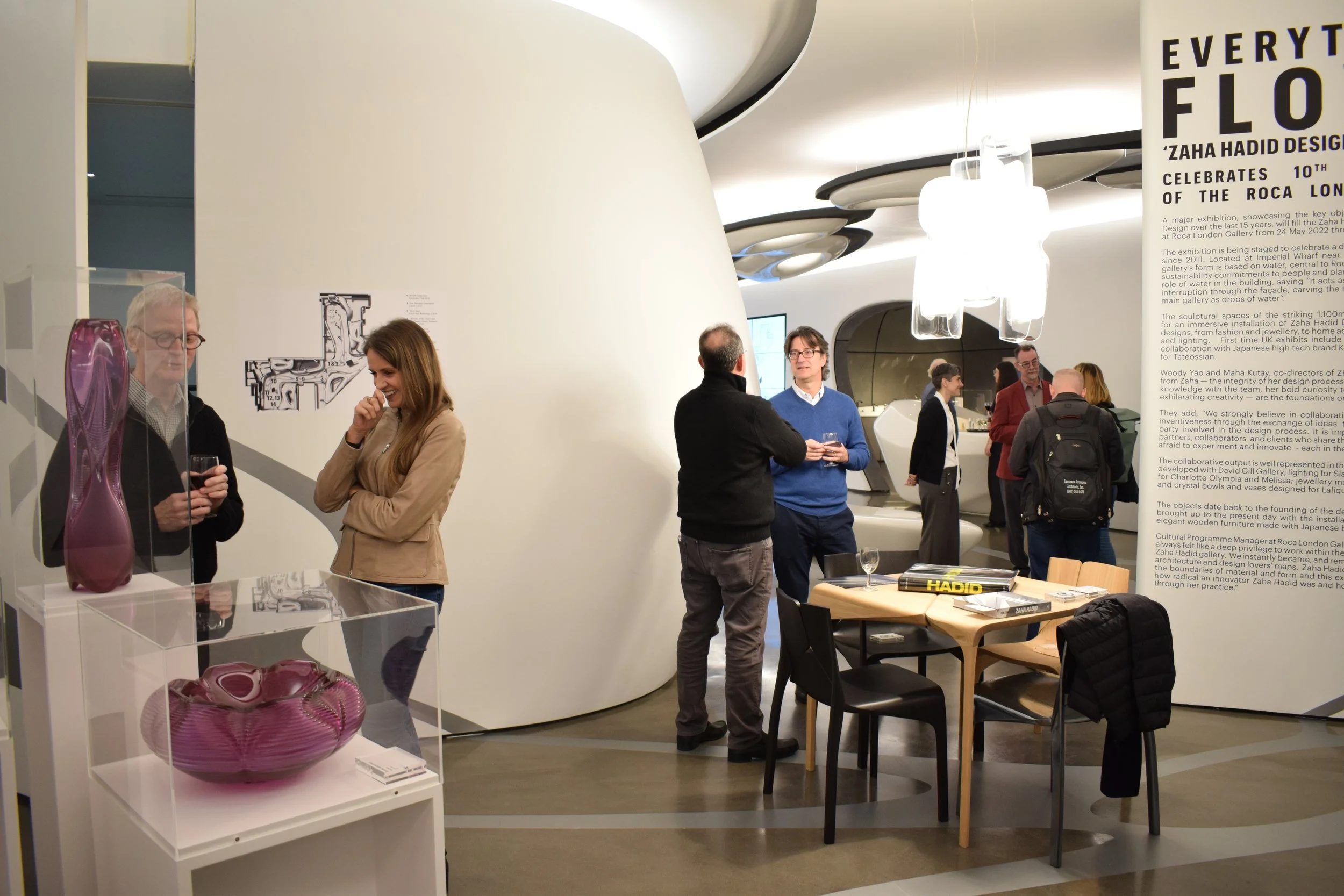 At the Roca London Gallery, attendees were able to enjoy refreshments amid the Everything Flows exhibition of Zaha Hadid Design. Photos courtesy of Roca London Gallery.