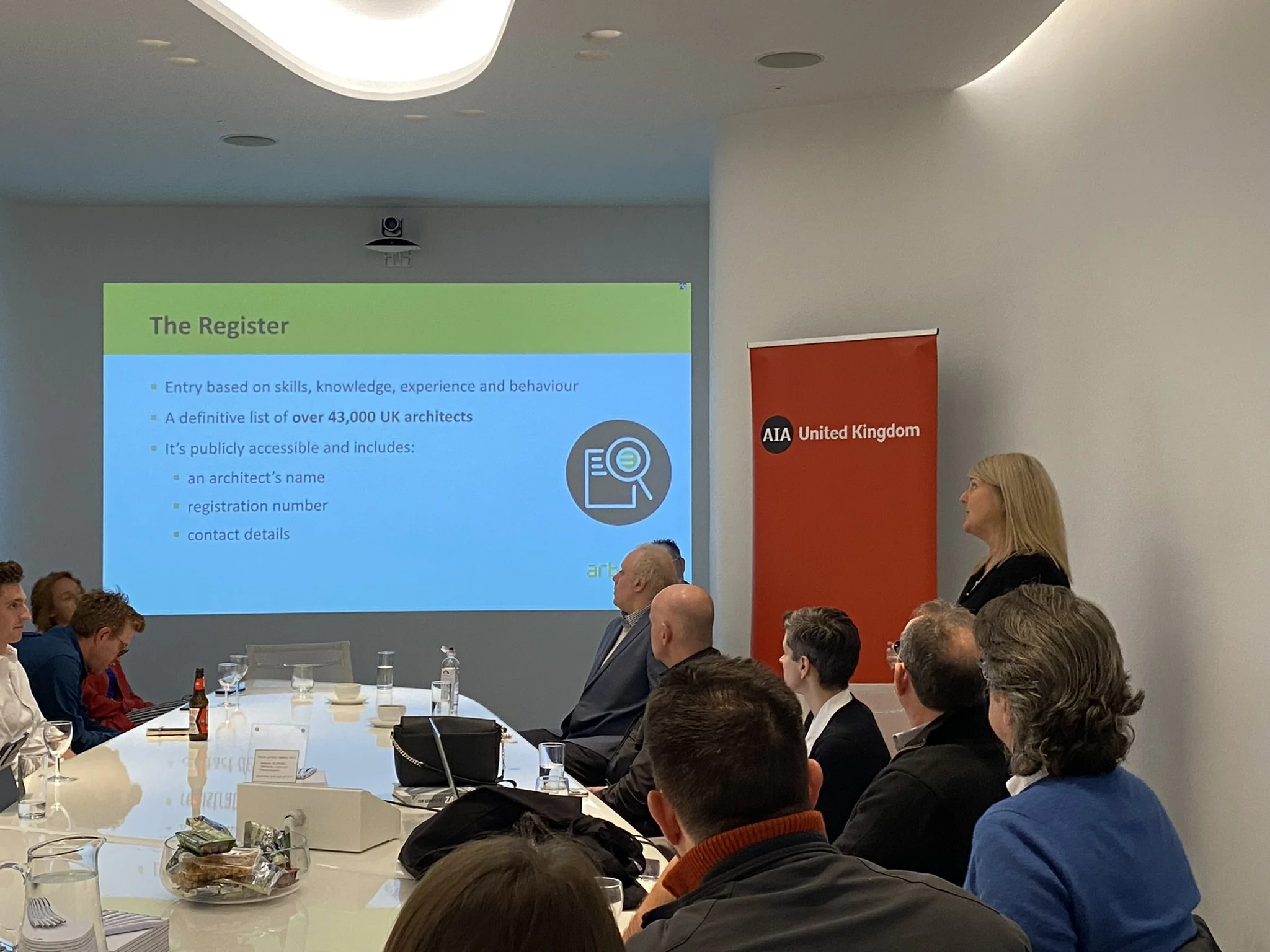 Emma Matthews, Director of Governance and International at ARB, presenting on UK paths to qualification. Photo by Adelina Koleva, AIA.
