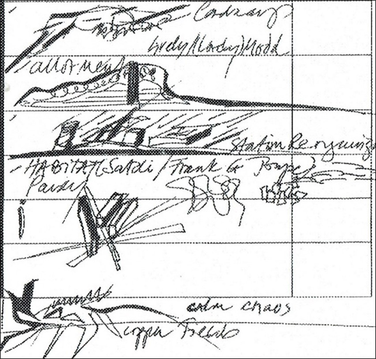 Thanks to Yasin Visram and Steve Jolly an exclusive record of Zaha Hadid’s unique thought process remains. Whereas other jurors kept simple notes on their jury cards, she took the time to draw futuristic thumbnail sketches with cryptic titles – ‘sugar cubes’ for the first one; ‘calm chaos’ for the last one; and ‘shining city’ along the way… Did any of the student’s designs inspire her future work? Or vice versa?