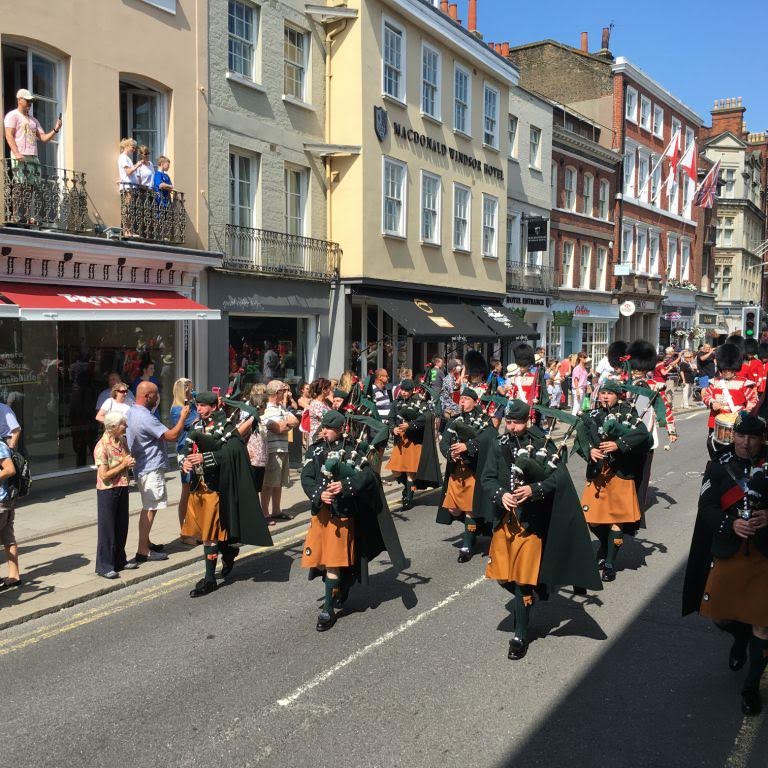 In Windsor, after ascending from the river bank to the castle, we were greeted by the Changing of the Guard marching down the high street, with a prime viewing spot secured in the porch of Windsor Guildhall.