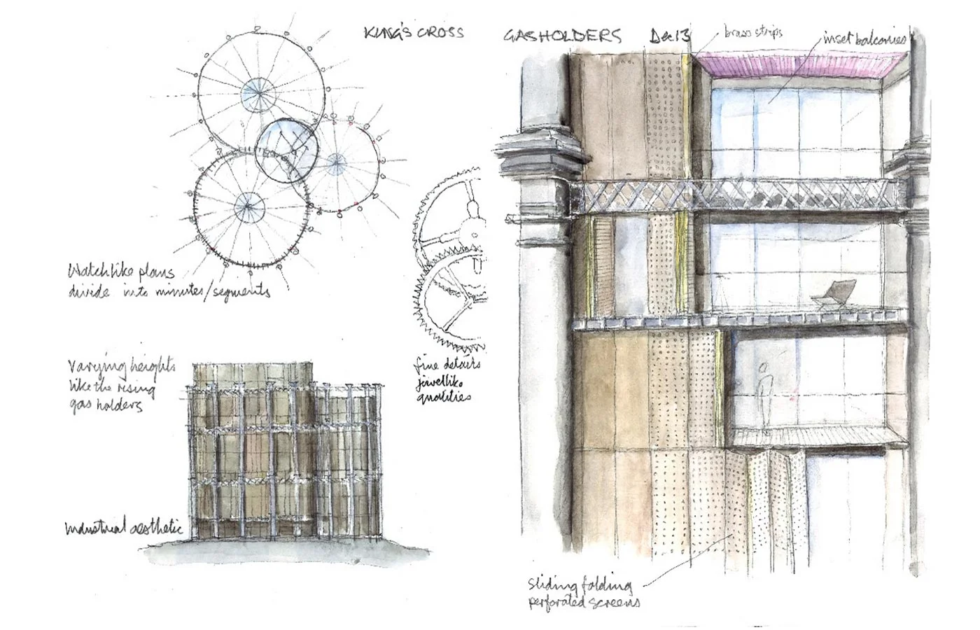 The key feature and design driver of the project is the reuse of three 1867 grade II listed gasholders. Although not reconstructed in their original position, the gasholders really define the project's design. The design concept provides three drums of accommodation at differing heights to suggest the movement of the original gasholders, which would have risen up or down depending on the pressure of the gas within. A fourth gasholder structure is located at the centre of the gasholder structural frames and forms an open courtyard.